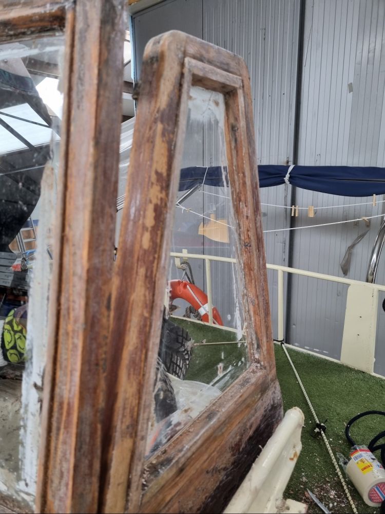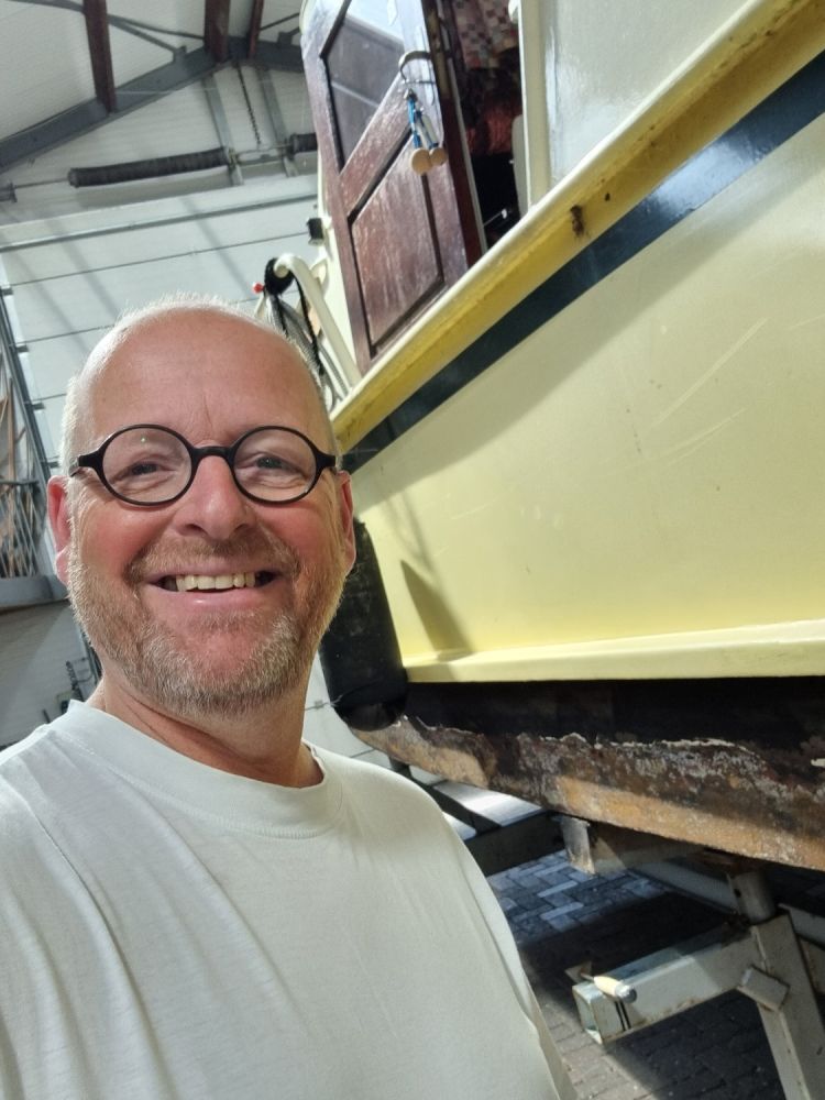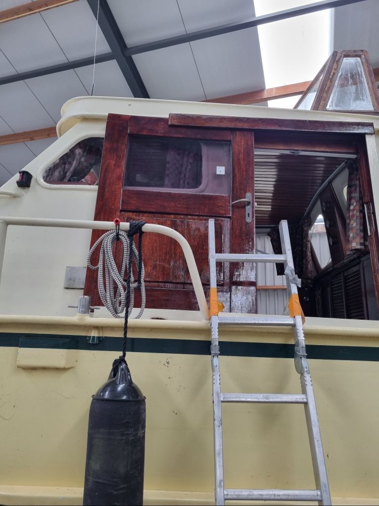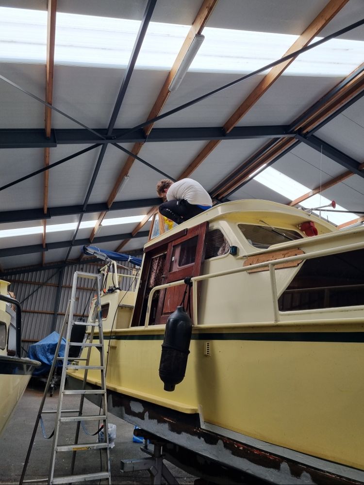Naast het onderwaterschip gaan we ook de kleine roestplekjes op het bovenschip bewerken en al het hout. Dat wil zeggen de deuren en het scherm bovenop. Stapje voor stapje, dan komt het goed..