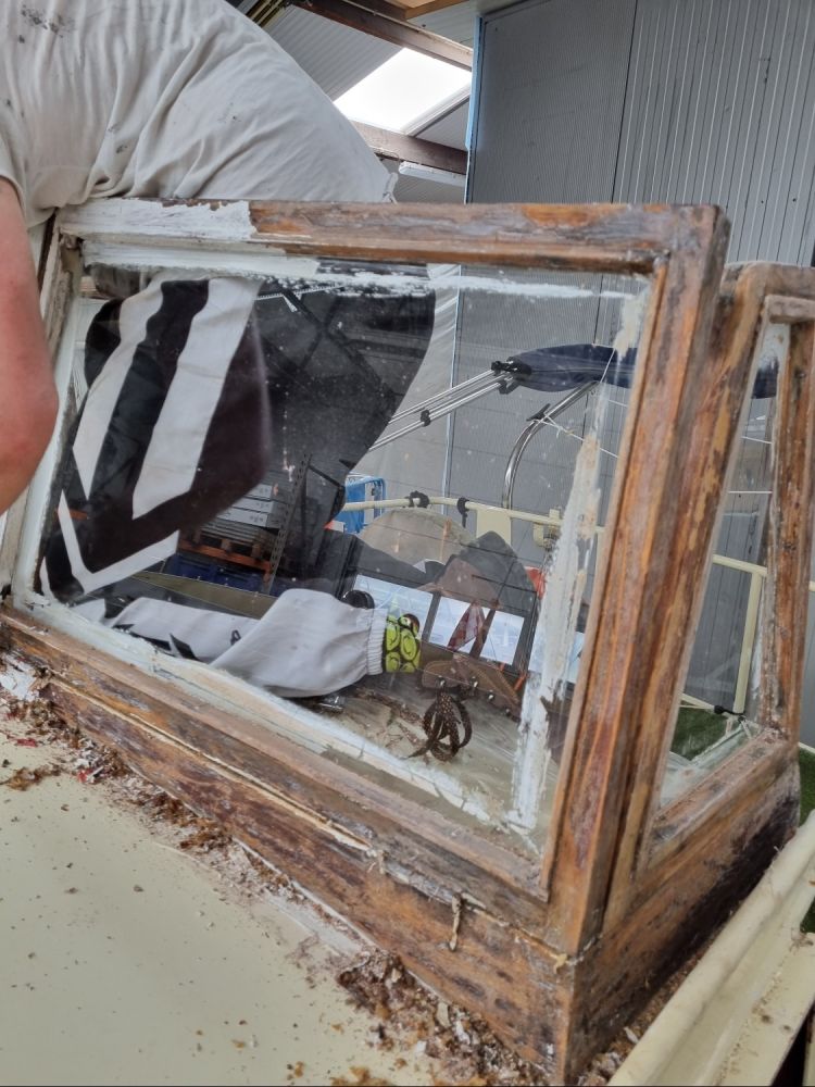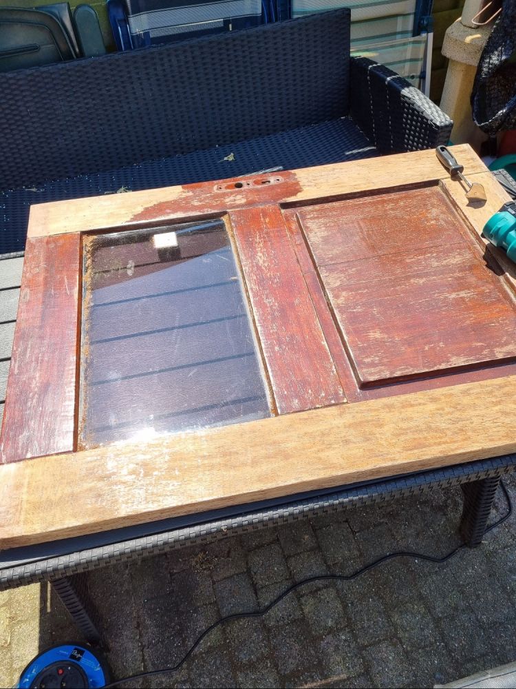 - Hout van het kapje met afbijtmiddel schoongekrapt.