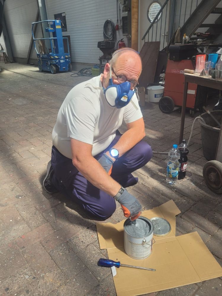 We moeten flink aan de bak door alle kleine roestvlekjes af te krabben en te voorzien van 6 lagen primer.