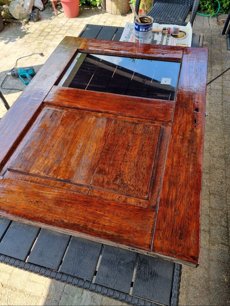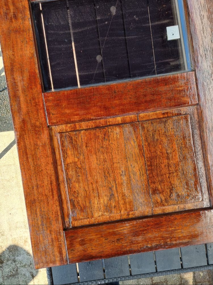 De deur aan bakboord hebben we vorige week meegenomen om opnieuw in de verf te zetten, Met de verfbrander alle oude lak verwijderd en 2x opnieuw gelakt. Vandaag hebben we de deur aan stuurboord meegenomen. Daar gaan we morgen aan beginnen.