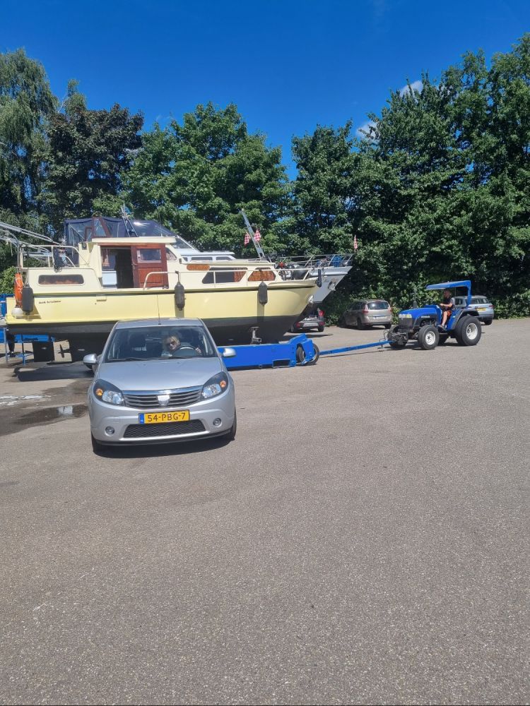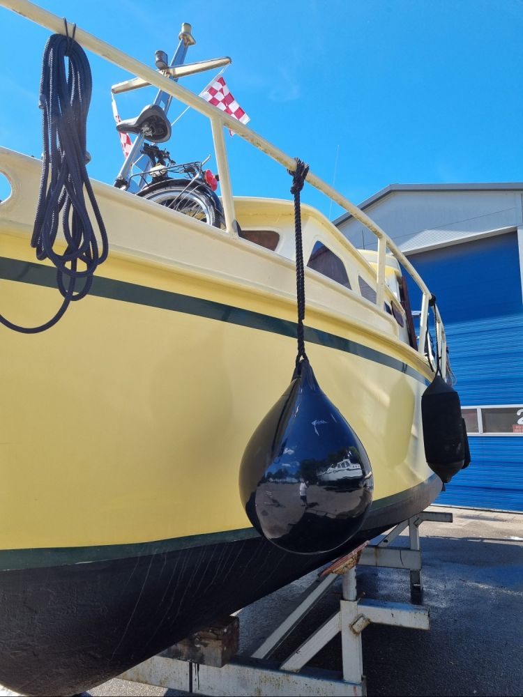 De roestplekjes op de romp waren geschuurd maar zijn nog 2x in de primer gezet en afgelakt in dezelfde kleur als de boot. Gelukkig had de oude eigenaar de verf in de boot laten staan. Nu het dek nog, maar dat kan nog de hele zomer.