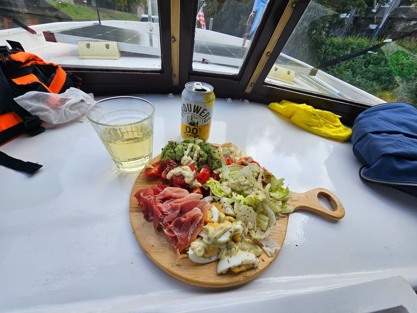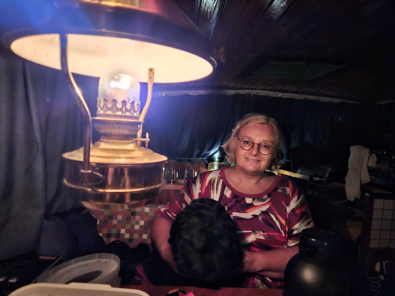 ''s Avonds lekker uit eten geweest bij een restaurant waar ook Jasper naar binnen mocht. Daarna koffie op het achterdek. Helaas begon het weer wat te regenen, dus naar binnen vertrokken. Gezellig met de olielamp aan.