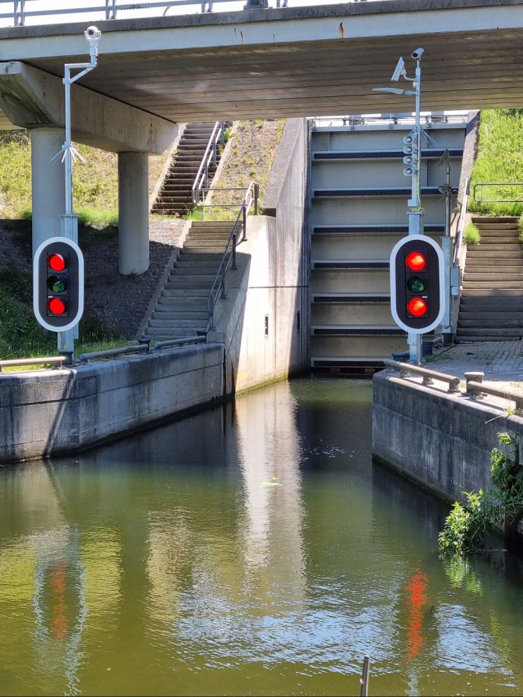 Bij de sluis aangekomen, bleek dat er maar 1 boot gelijktijdig de de sluis in kon. Voor ons mensen uit Oosterhout die we gisteren ook hadden gezien bij de sluis. Zij voeren erin, deur dicht en... beide lichten voor ons op rood. Of te wel, sluis is buiten bedrijf. Toen we de sluismeester opgeroepen hadden, bleek dat ze nog steeds een storing hadden. De boot uit Oosterhout lag gezellig tussen 2 deuren en 2 muren van 6 meter hoog..