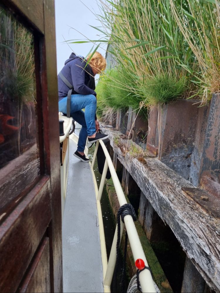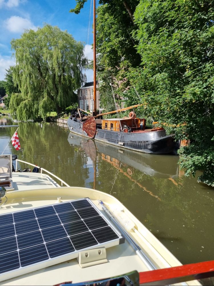 En daar lagen we.. Het eerste wat in ons opkwam, was de Botenwacht bellen. Maar die gaven aan ons alleen te kunnen helpen als we aan de kant zouden liggen. En dan ook nog bereikbaar zouden zijn per auto. Met kunst en vliegwerk, door het klimmen door tuinen van bewoners daar, probeerden we de kant te bereiken. Gelukkig kwam daar een andere schipper met een heel klein bootje die ons even naar de kant kon brengen.