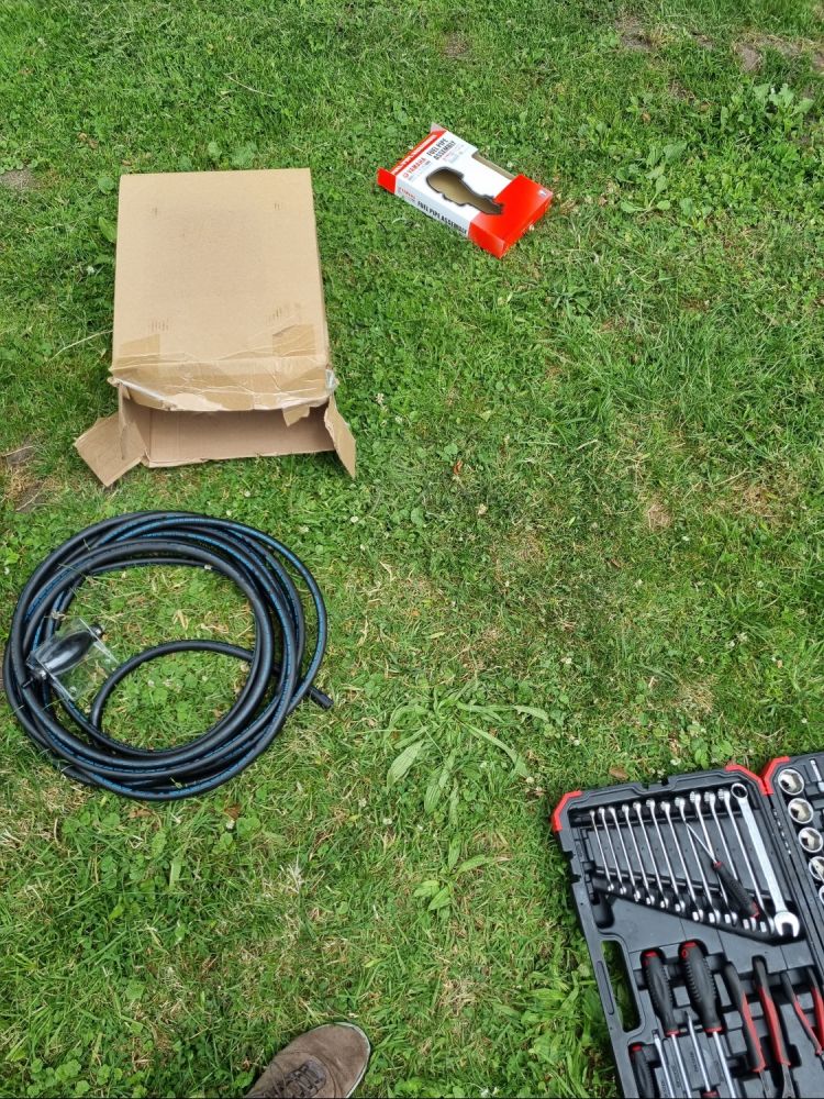 De andere dag, rond 13.00 uur, kwam Youri aan. Met reserve tankje! Al snel vond hij een mooi plekje en installeerde het. De brandstoftoevoer was al snel omgelegd. De retour (de motor pakt meer brandstof die het op het dat moment kan verbruiken en voert de overtollige brandstof af via een aparte leiding naar de dieseltank) kon wel blijven zitten. Er zou niet veel retour komen van de motor, dat kon geen kwaad. We konden de andere dag gewoon weer gaan varen, gelukkig.