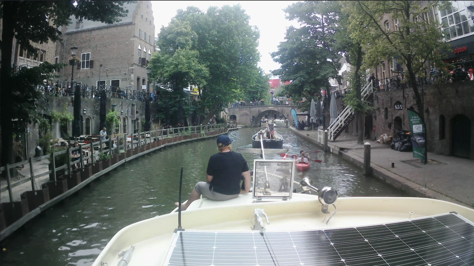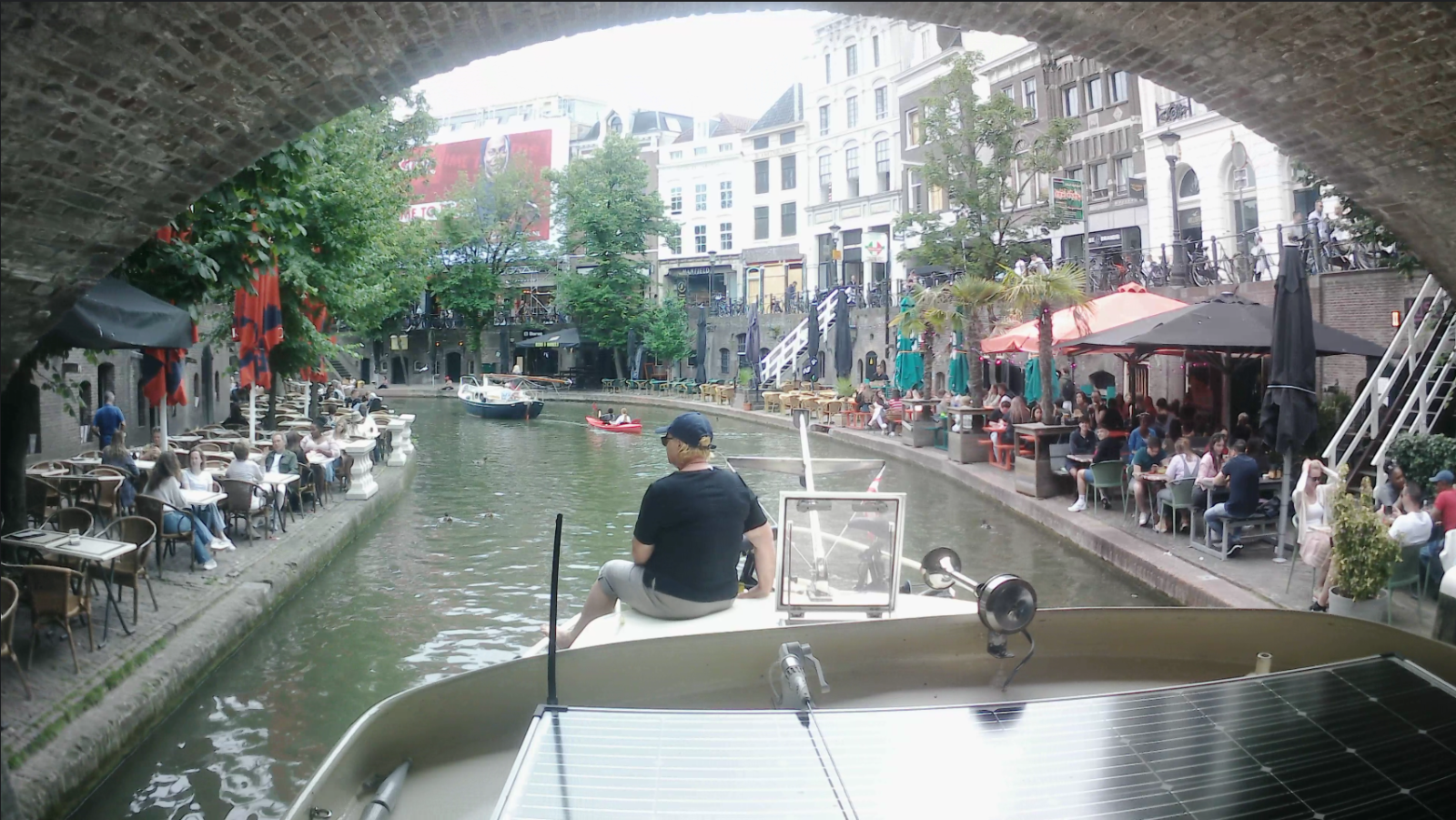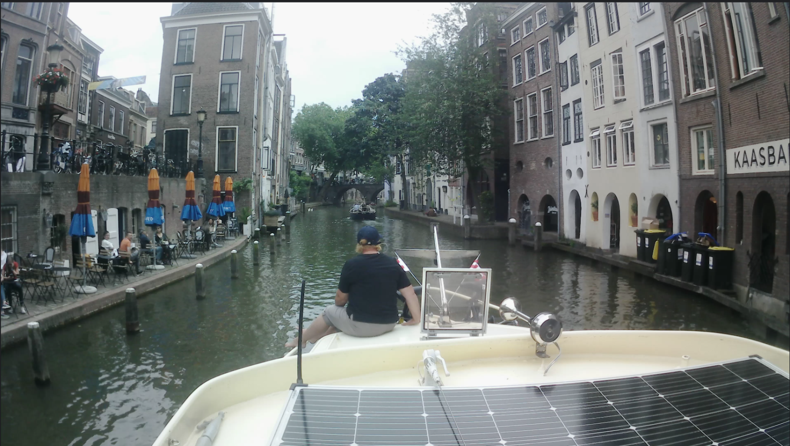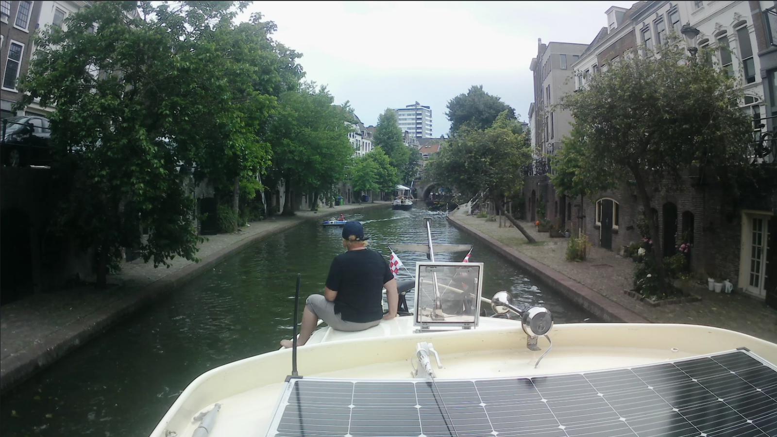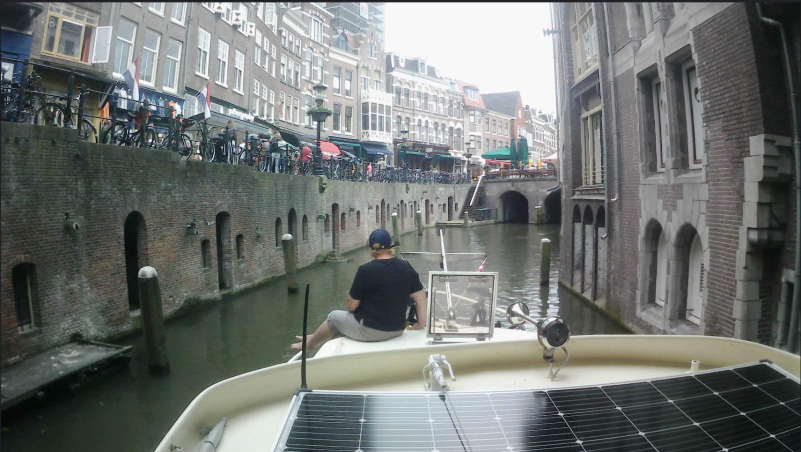 De route door Utrecht was absoluut prachtig. Het weer was ondertussen weer top gelukkig! We voeren door de Oude Gracht, dwars door het centrum van Utrecht. Langs alle terassen en tussen de trapbootjes en kano's van veelal buitenlandse, toeristen, door. En de bruggen? Geen probleem! Zelfs de 'enge' Stadhuisbrug waar, als je erin vaart niets ziet omdat de brug, die 50 meter lang is, halverwege een knik maakt, was zo genomen. Helaas hebben we geen foto's ervan, maar wel een video: