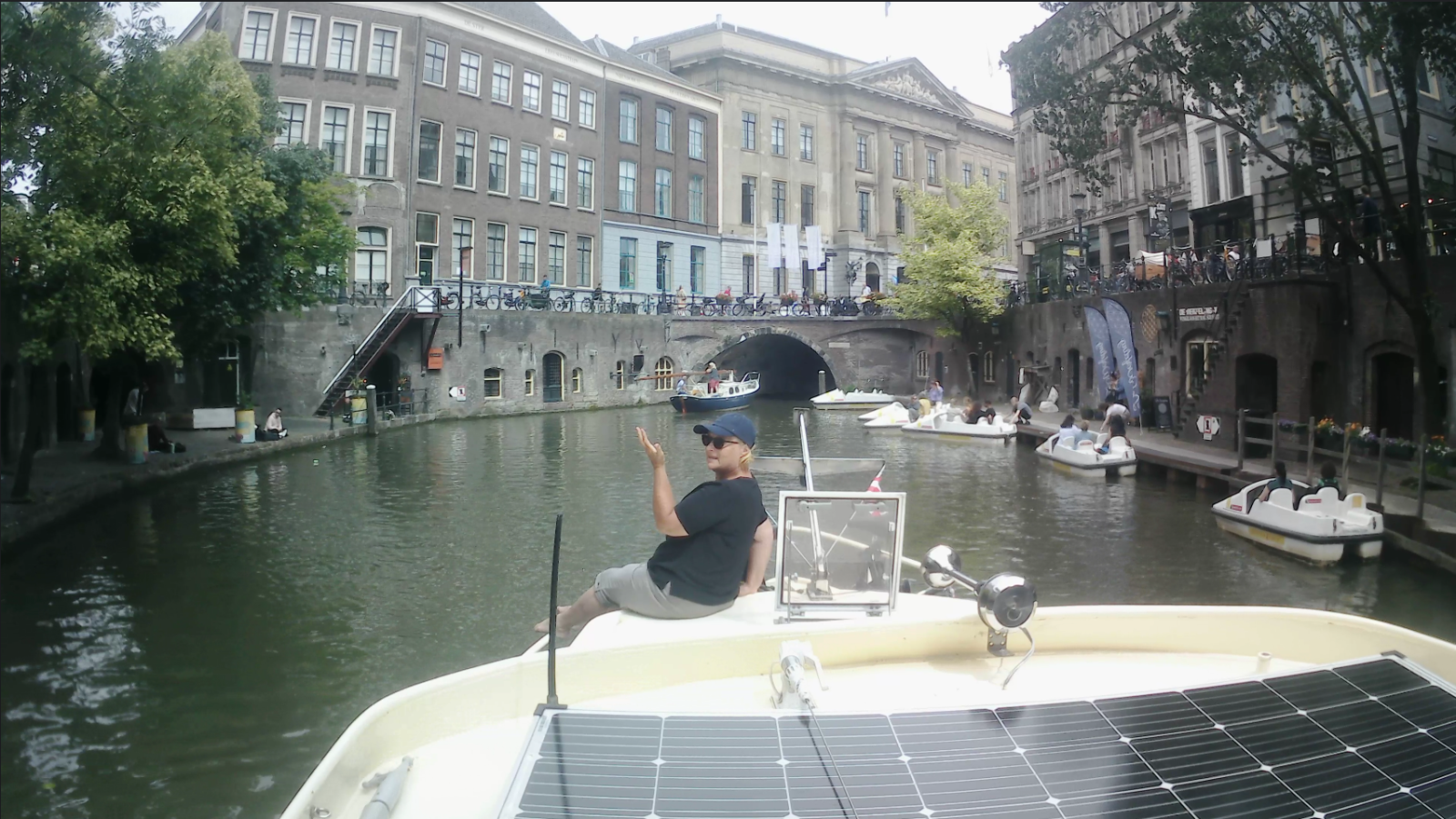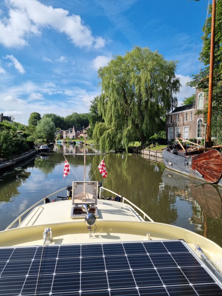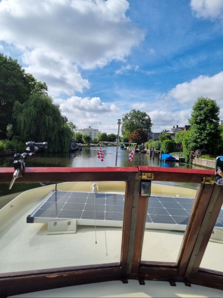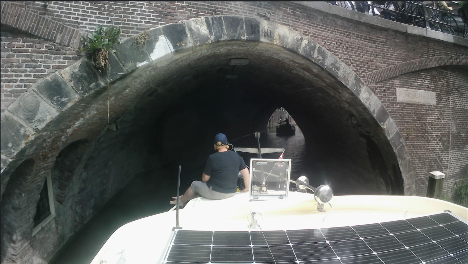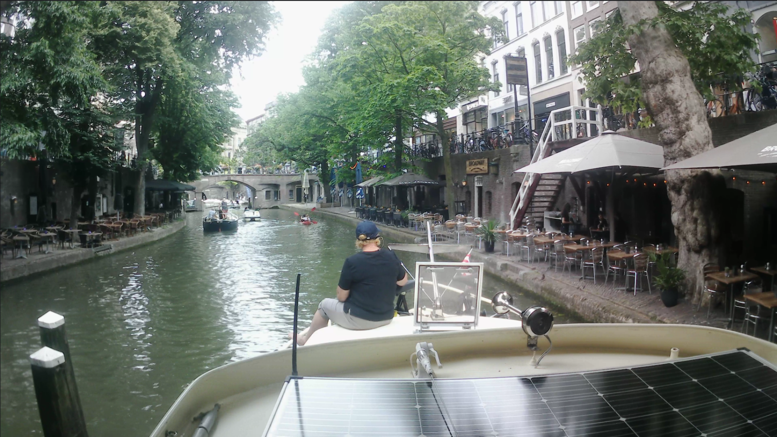 De route door Utrecht was absoluut prachtig. Het weer was ondertussen weer top gelukkig! We voeren door de Oude Gracht, dwars door het centrum van Utrecht. Langs alle terassen en tussen de trapbootjes en kano's van veelal buitenlandse, toeristen, door. En de bruggen? Geen probleem! Zelfs de 'enge' Stadhuisbrug waar, als je erin vaart niets ziet omdat de brug, die 50 meter lang is, halverwege een knik maakt, was zo genomen. Helaas hebben we geen foto's ervan, maar wel een video: