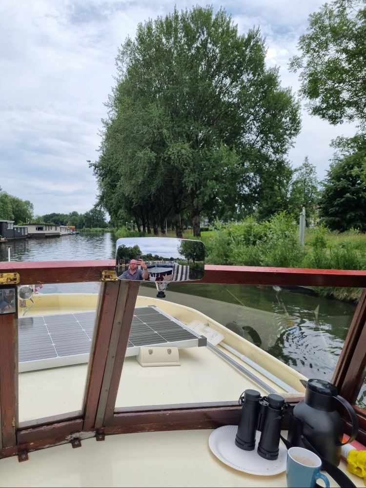 Wonder boven wonder bleek de motor te starten en konden we de kant verlaten en draaien om naar de sluis terug te gaan. Maar na 10 meter.. broem.. en de motor stopte. Toen kon de schipper niet anders dan ons te slepen omdat we midden op het Amsterdam-Rijn kanaal dobberden.