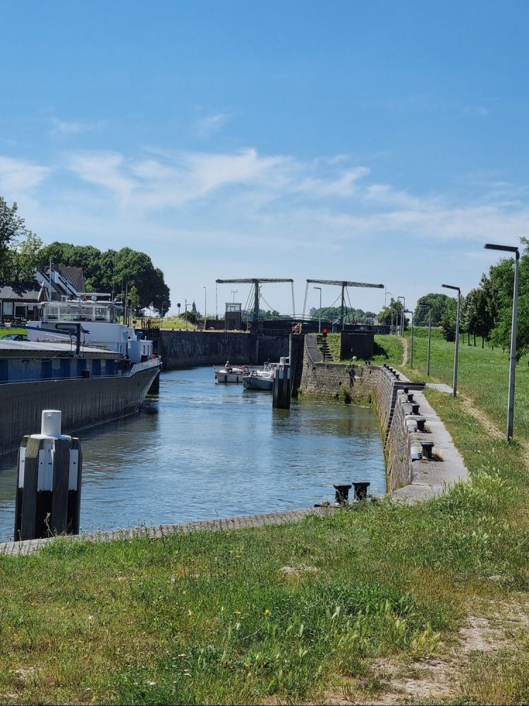 Net voor de haven, lag nog één sluisje. Deze zou openstaan zodat we daar geen oponthoudt meer zouden hebben. Toen we aankwamen, stond inderdaad de sluis open, maar stond het licht aan onze kant op rood. Marjan ging maar te voet kijken hoe het aan de andere kant van de sluis was. Was er wellicht iets aan de hand? De plaatselijke jeugd, sprong gezellig van de sluis lekker in het water. Uiteraard mocht dat niet en ze werden dan ook door de politie gewaarschuwd dat dat niet mocht. De politie was nog geen 30 seconden weg en de eerste sprong alweer in het water.