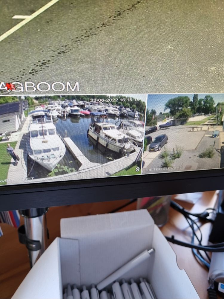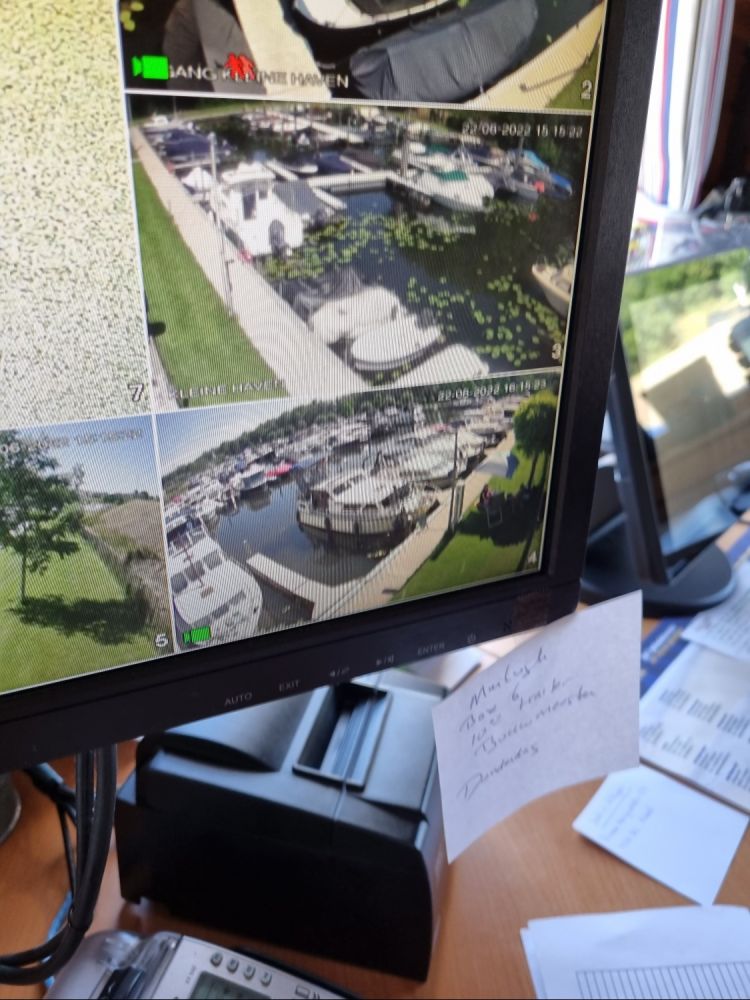 De haven werd 24/7 bewaakt en op het havenkantoor zag ik onze boot op de monitor liggen. Snel even een foto ervan gemaakt, uiteraard..