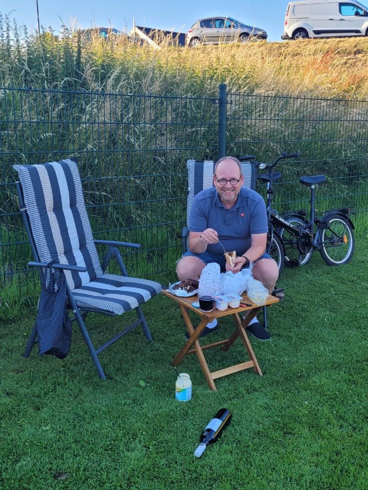 We wilden uit eten gaan en hadden op Maps gezocht naar een restaurant. Nou, die zou er zitten.. Op een kwartier fietsen zou een Pizza-restaurant zitten. Dus wij, vol goede moed, op weg. Het restauran bleek een soort shoarma, donner, pizza, snackbar te zijn. Aldaar direct besloten dat we zouden afhalen en het lekker in de haven, onder de bomen zouden opeten. Zo gezegd, zo gedaan!