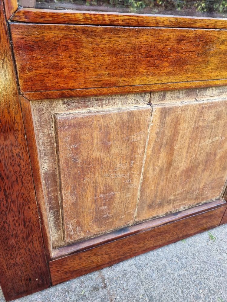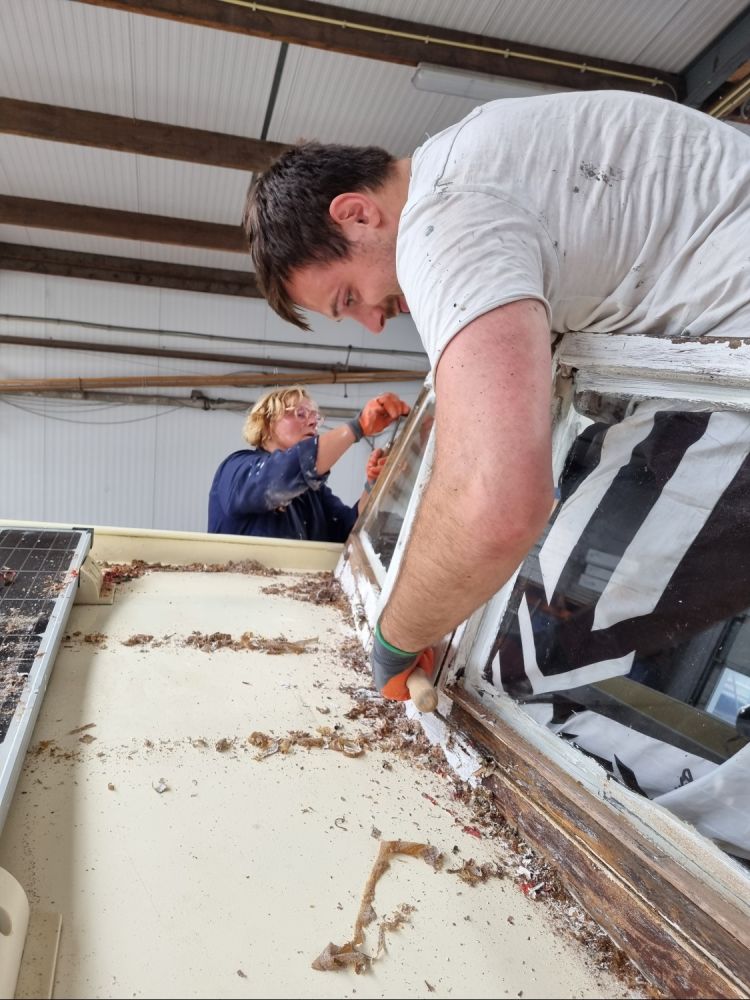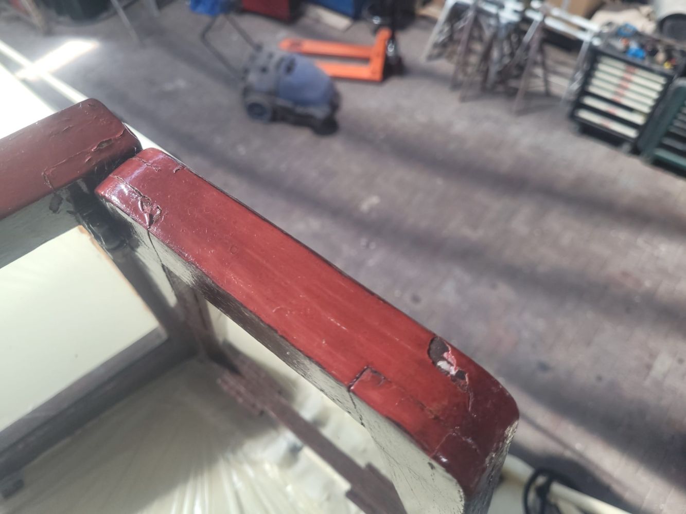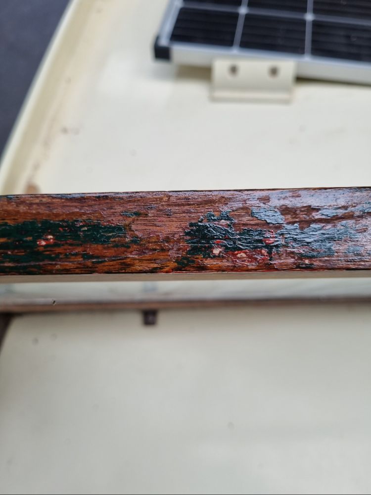 - Hout van het kapje met afbijtmiddel schoongekrapt.