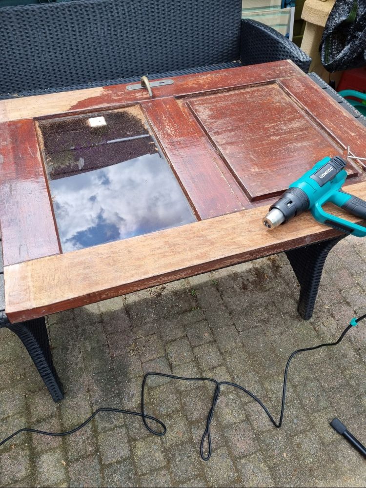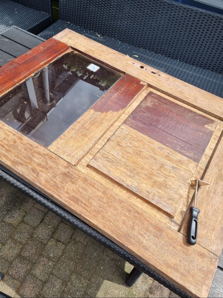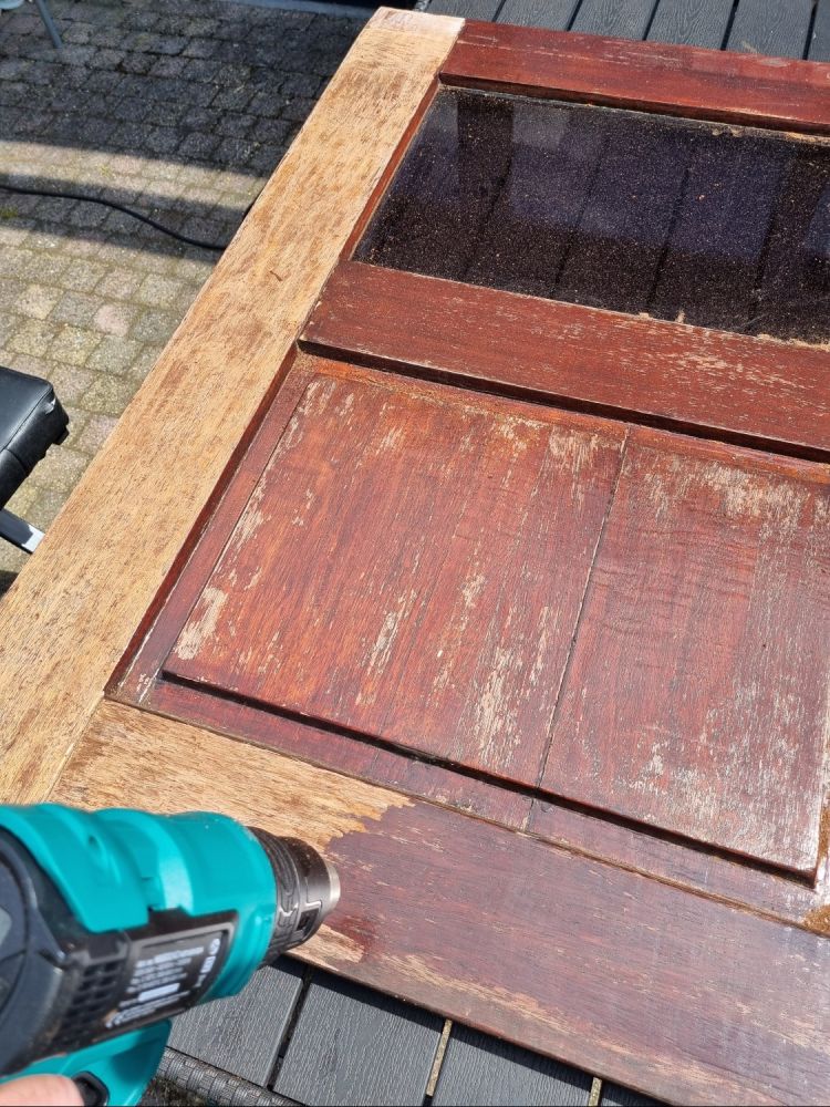We hebben één deur mee naar huis genomen om de lak er af te branden. Daar gaan we morgen maar eens aan beginnen.
