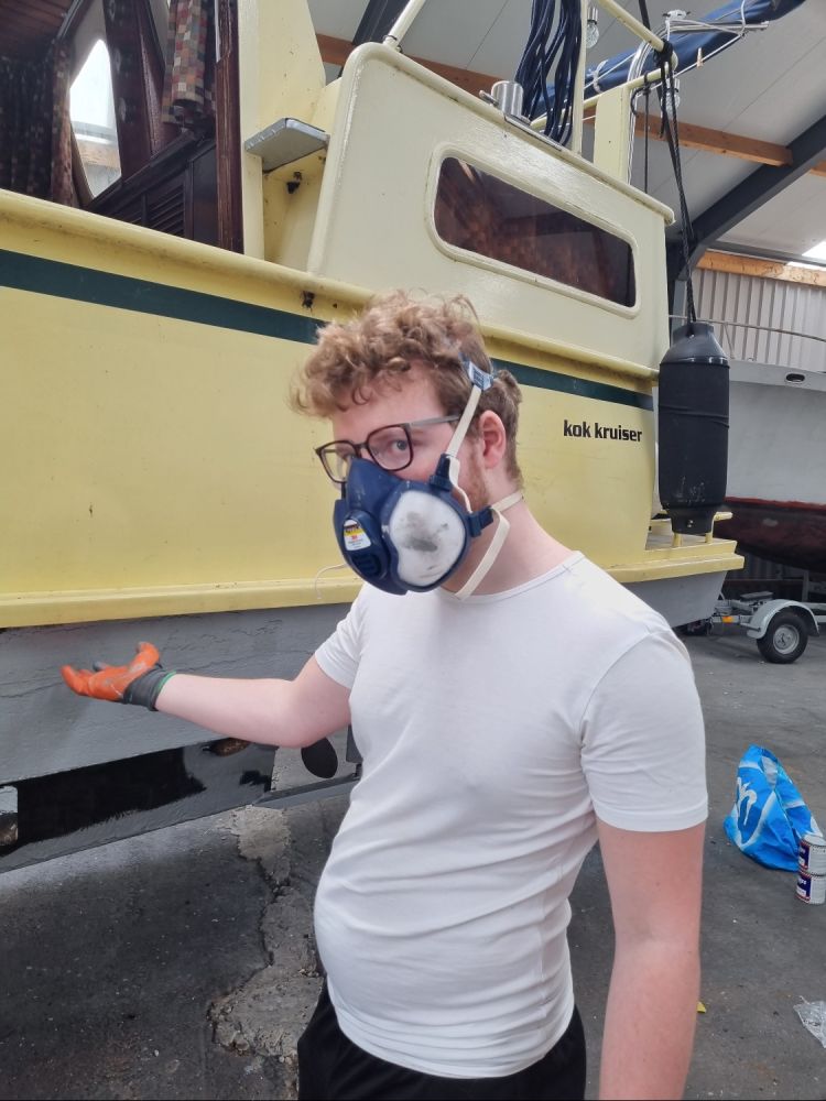 De roestplekjes op de romp waren geschuurd maar zijn nog 2x in de primer gezet en afgelakt in dezelfde kleur als de boot. Gelukkig had de oude eigenaar de verf in de boot laten staan. Nu het dek nog, maar dat kan nog de hele zomer.