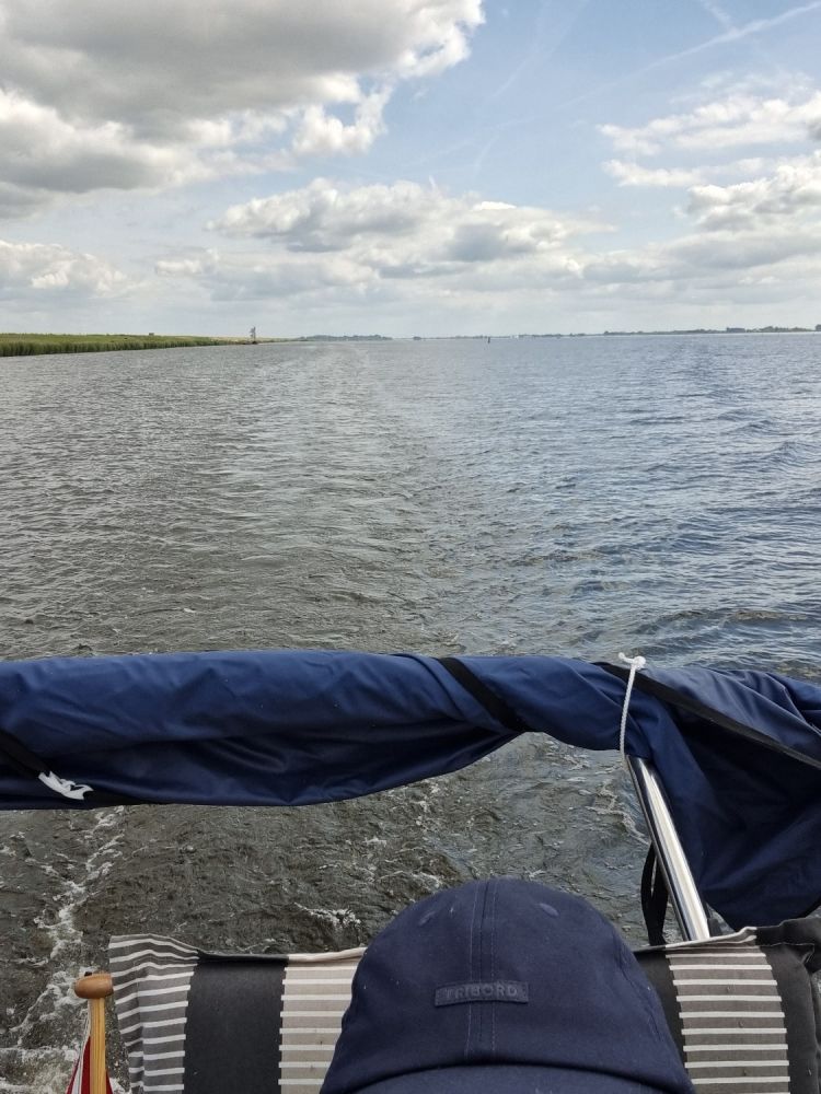 Vanmorgen opgestaan, water getapt en om 10 uur de haven van Blokzijl verlaten. De eerste kilometers was er nog wel iets te zien, maar al snel moesten we het 'grote water' op: het Zwartemeer gevolgd door het Ketelmeer. Gelukkig was de wind gaan liggen en konden we, in korte mouwen en dito broek, lekker op het bovendek zitten.