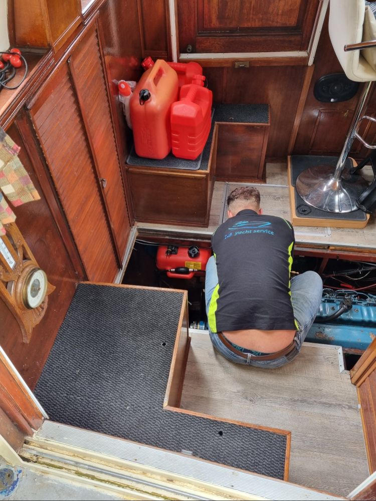 De andere dag, rond 13.00 uur, kwam Youri aan. Met reserve tankje! Al snel vond hij een mooi plekje en installeerde het. De brandstoftoevoer was al snel omgelegd. De retour (de motor pakt meer brandstof die het op het dat moment kan verbruiken en voert de overtollige brandstof af via een aparte leiding naar de dieseltank) kon wel blijven zitten. Er zou niet veel retour komen van de motor, dat kon geen kwaad. We konden de andere dag gewoon weer gaan varen, gelukkig.