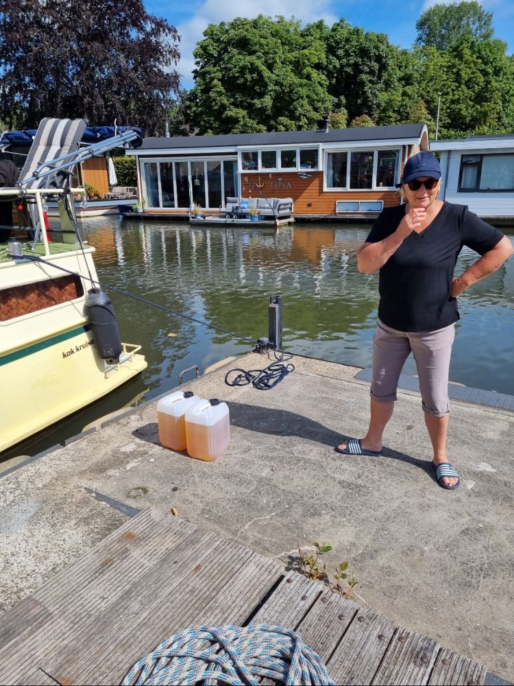 Na de eerste check, na 45 minuten, bleek dat de tank al op bijna 50% te zitten! Of te wel, een verbruik van ca. 12 liter per uur. We zouden niet eens door Utrecht komen met onze 30 liter diesel en het kleine beetje in de tank. We moesten meer diesel hebben! Maar hoe kom je daar aan, midden op de Vecht.