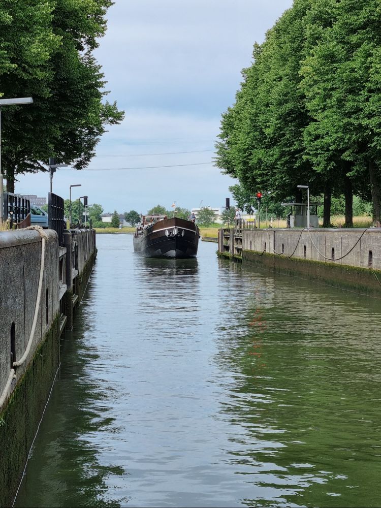 Wonder boven wonder bleek de motor te starten en konden we de kant verlaten en draaien om naar de sluis terug te gaan. Maar na 10 meter.. broem.. en de motor stopte. Toen kon de schipper niet anders dan ons te slepen omdat we midden op het Amsterdam-Rijn kanaal dobberden.