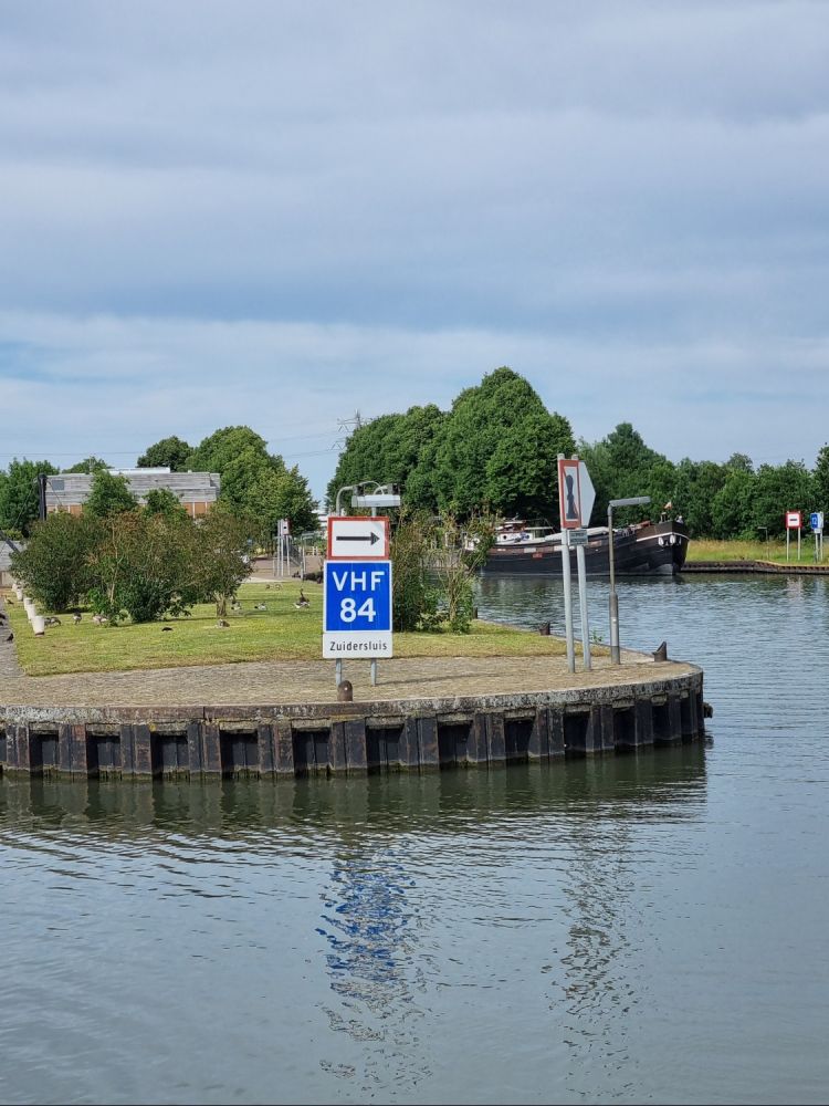 We voeren de sluis door om links af te slaan. Marjan op de boeg, om het verkeer op het kanaal in de gaten te houden. Omdat er boten aan kwamen, moesten we rechtsaf om, na de boten, de oversteek te maken. We hobbelden behoorlijk, maar so far so good.