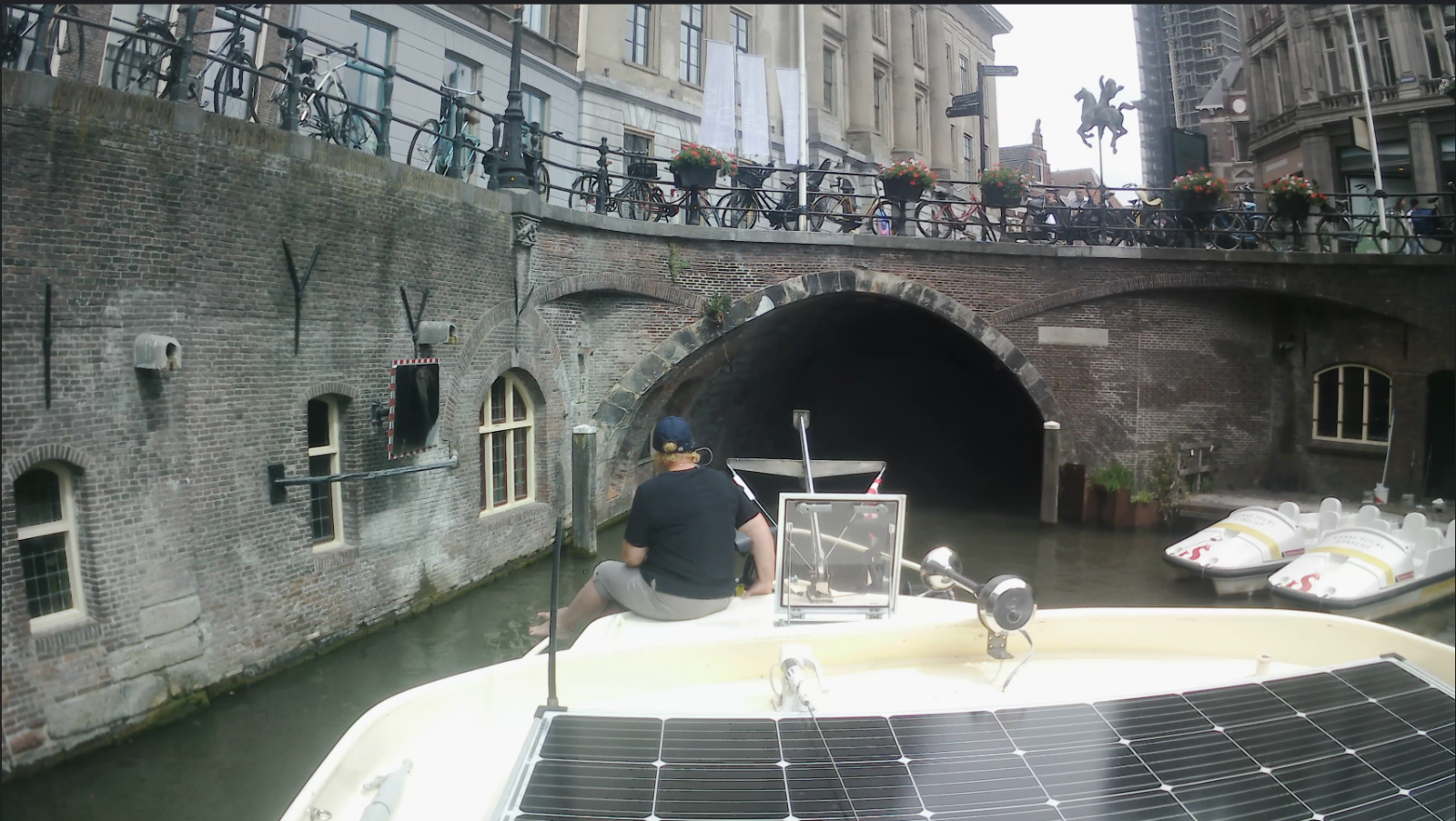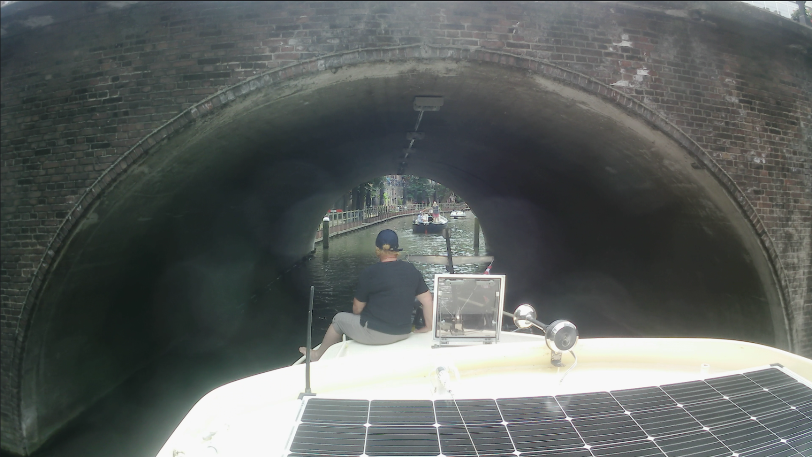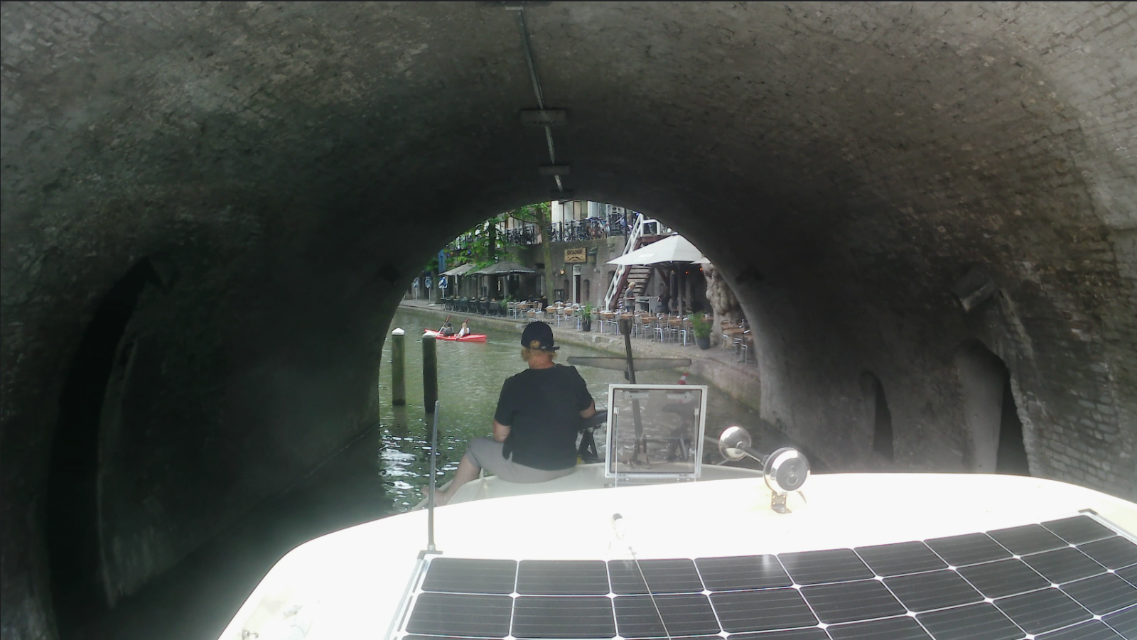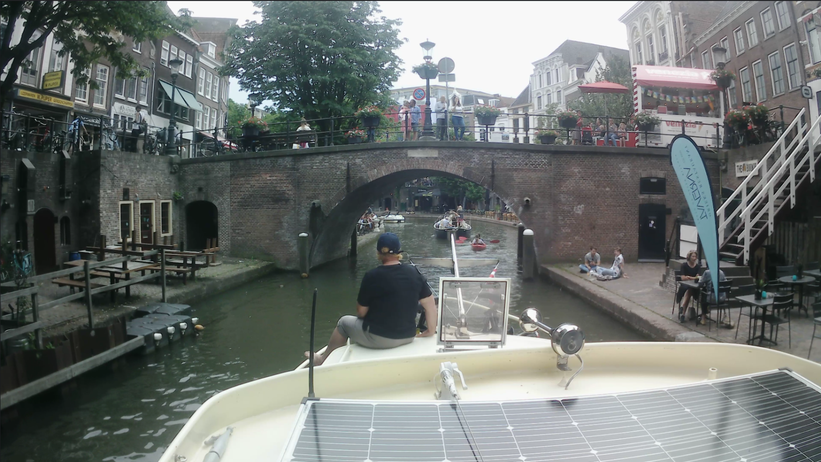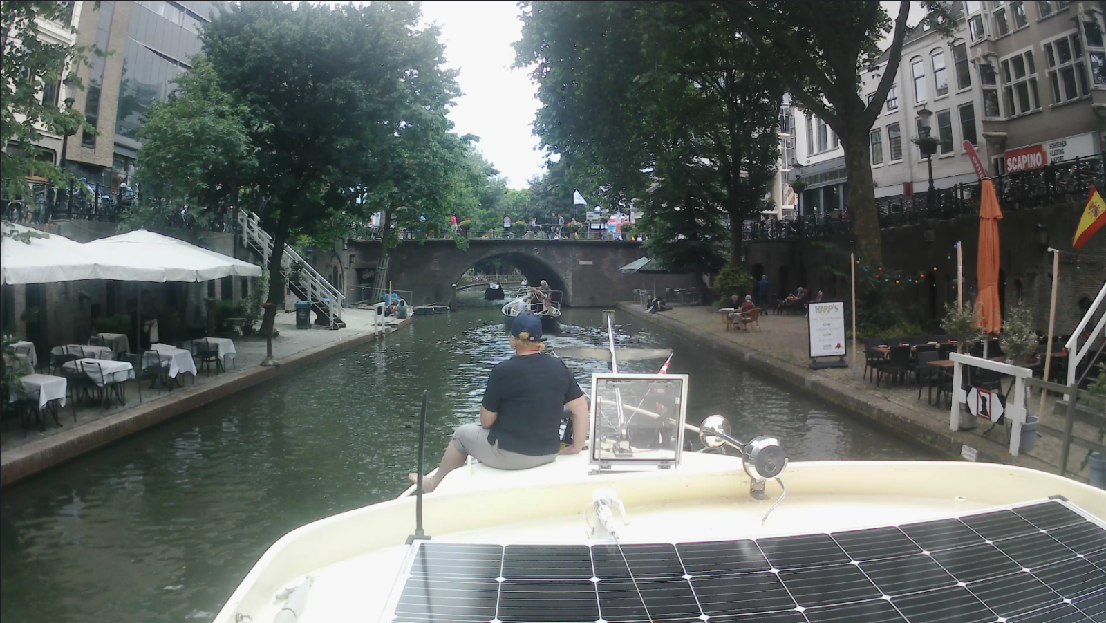 De route door Utrecht was absoluut prachtig. Het weer was ondertussen weer top gelukkig! We voeren door de Oude Gracht, dwars door het centrum van Utrecht. Langs alle terassen en tussen de trapbootjes en kano's van veelal buitenlandse, toeristen, door. En de bruggen? Geen probleem! Zelfs de 'enge' Stadhuisbrug waar, als je erin vaart niets ziet omdat de brug, die 50 meter lang is, halverwege een knik maakt, was zo genomen. Helaas hebben we geen foto's ervan, maar wel een video: